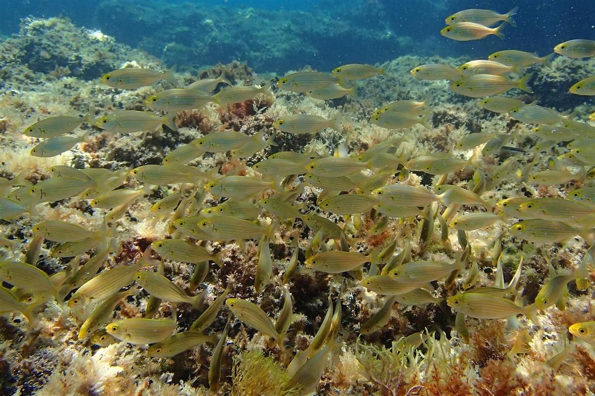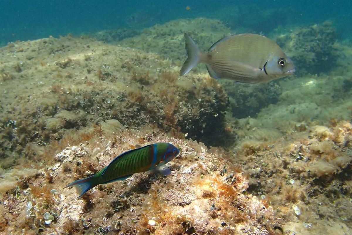 Séance de masque et tuba sur la plage de cap Rousset à Carry-le-Rouet, au cœur de la réserve marine de la côte bleue. Eau chaude, calme et avec une bonne visibilité donnent des conditions idéales pour approcher les nombreux poissons de cette réserve, peu farouches et parfois hénaurmes comme ces dorades de la taille d’un bras !