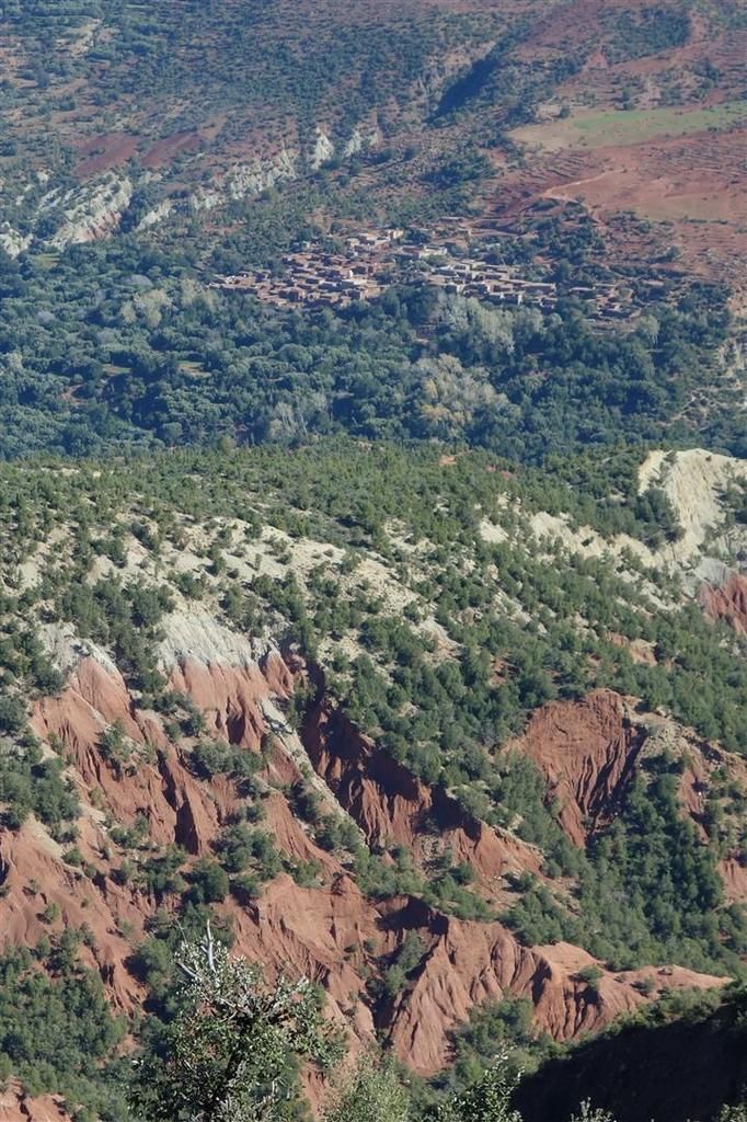 marnes rouges érodées et cultures en terrasses sur la route du Tizi N’Tchika, vers le village de Toufliht