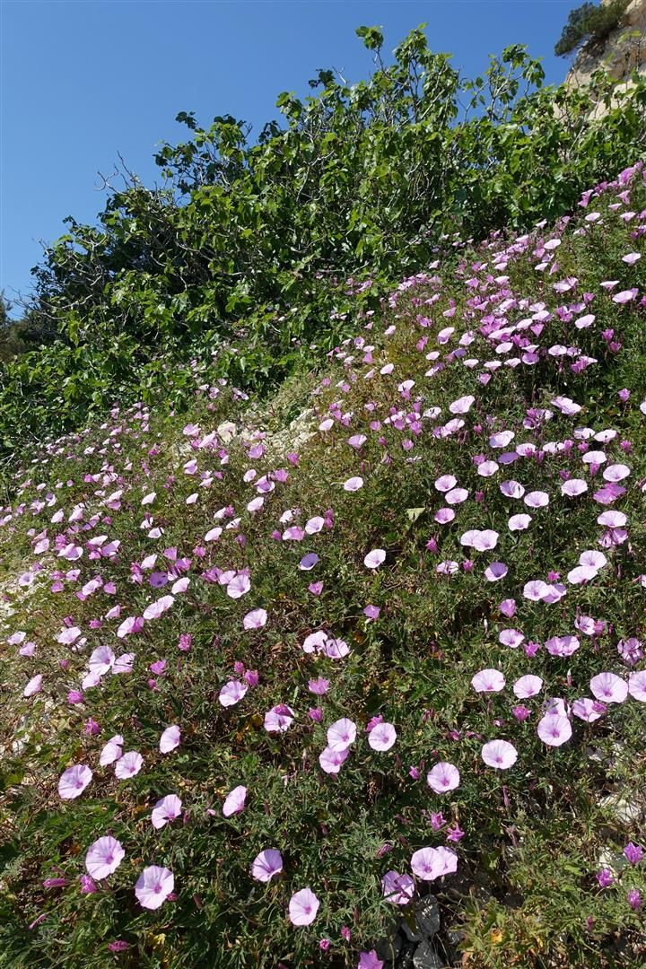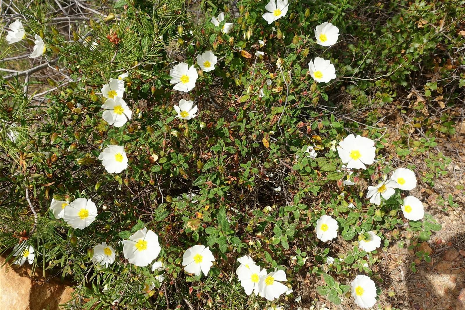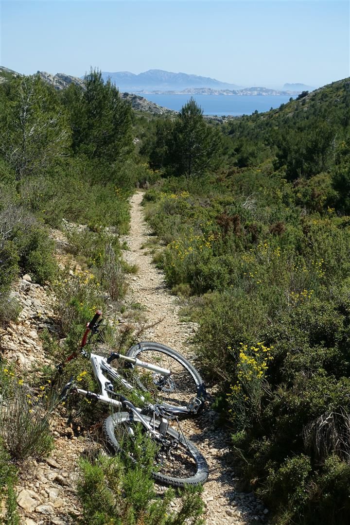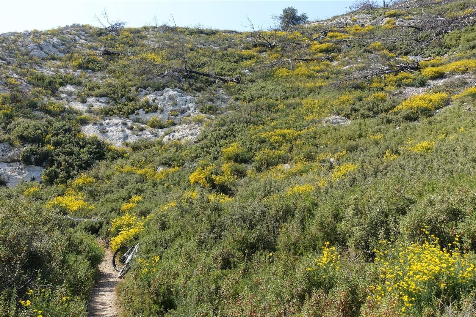 longue balade en VTT, creux du Loup, tour d'Ensuès, plaine de la Reynarde, le Canier, Fumadis, Saint-Julien les Martigues, retour par le vallon du Bon Jean puis Valméjeanne. Photos du vallon du Bon Jean, noyé sous les cistes et coronilles en fleurs, magnifique malgré les séquelles de l'incendie de juillet 2016.