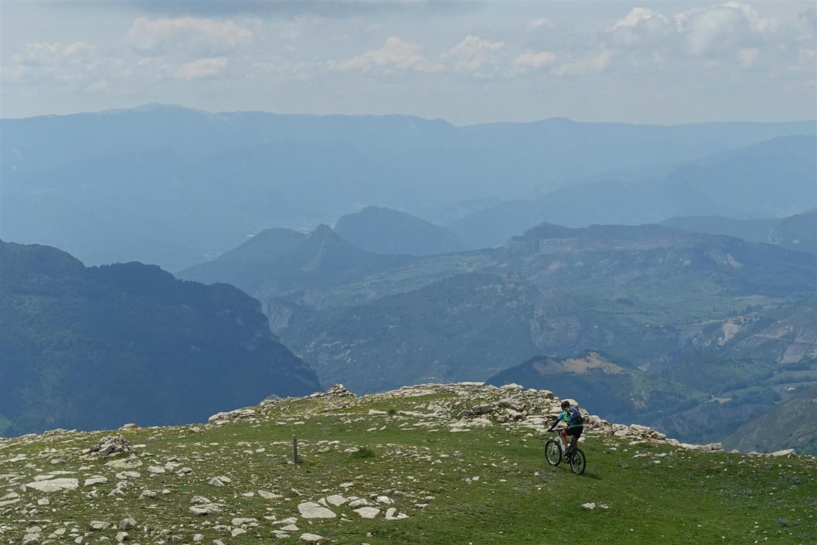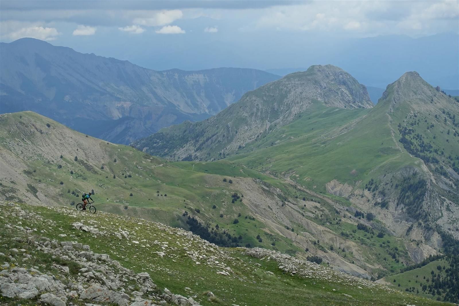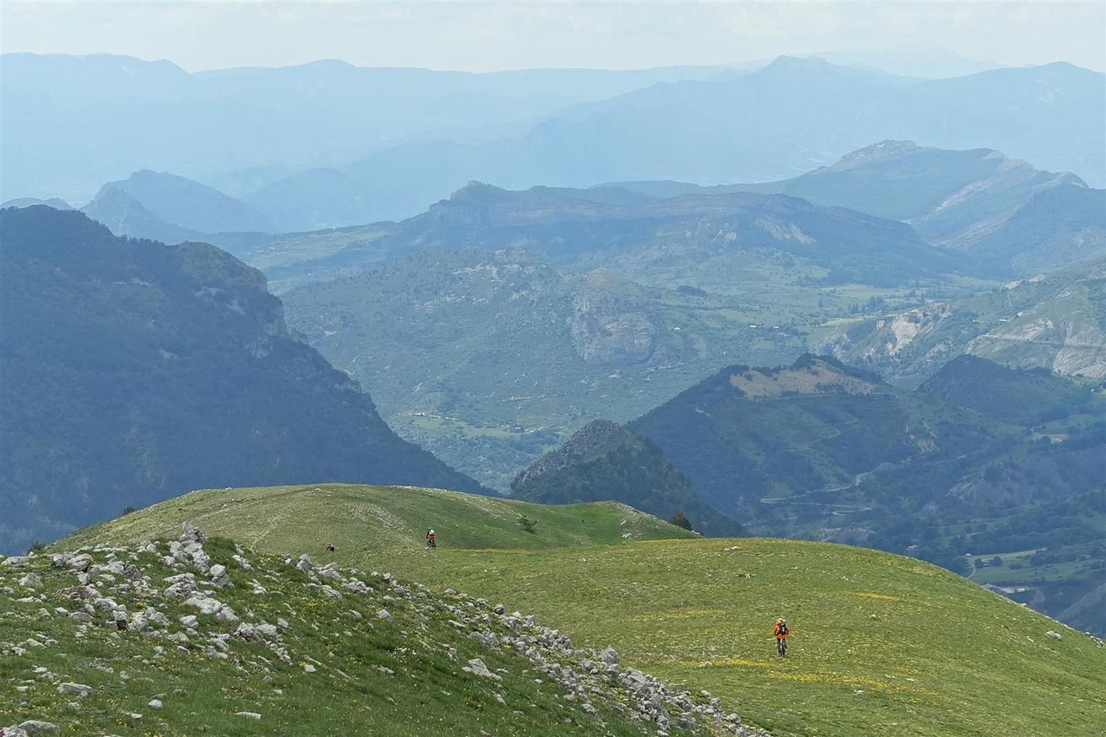 Journée de vélo de montagne dans les Préalpes dignoises, sur les Monges, ce sommet doté d’immenses prairies d’altitude qui sont autant d’invitations à rouler. C’est un terrain dessiné pour le VTT, découvert à pieds en octobre 2017, et qui offre des descentes intégralement roulantes dans des alpages fleuris actuellement en explosion de couleurs. La crête sud-ouest des Monges, qui s’apparente plutôt à une large croupe de prairies d’altitude, se parcourt ainsi à la descente exclusivement sur la selle, moyennant quelques slaloms entre pierres et… parterres de fleurs de montagne, et justifie bien le long portage de la fin de la piste aux Bastides à l’antécime est, via le col de la Croix de Veyre au versant nord littéralement jauni par la floraison. C’est une ligne ludique et esthétique à souhait sur cette crête peu marquée mais panoramique, avant une fin de descente plus raide et technique sur le versant nord de la crête de Pierre-Mont.
