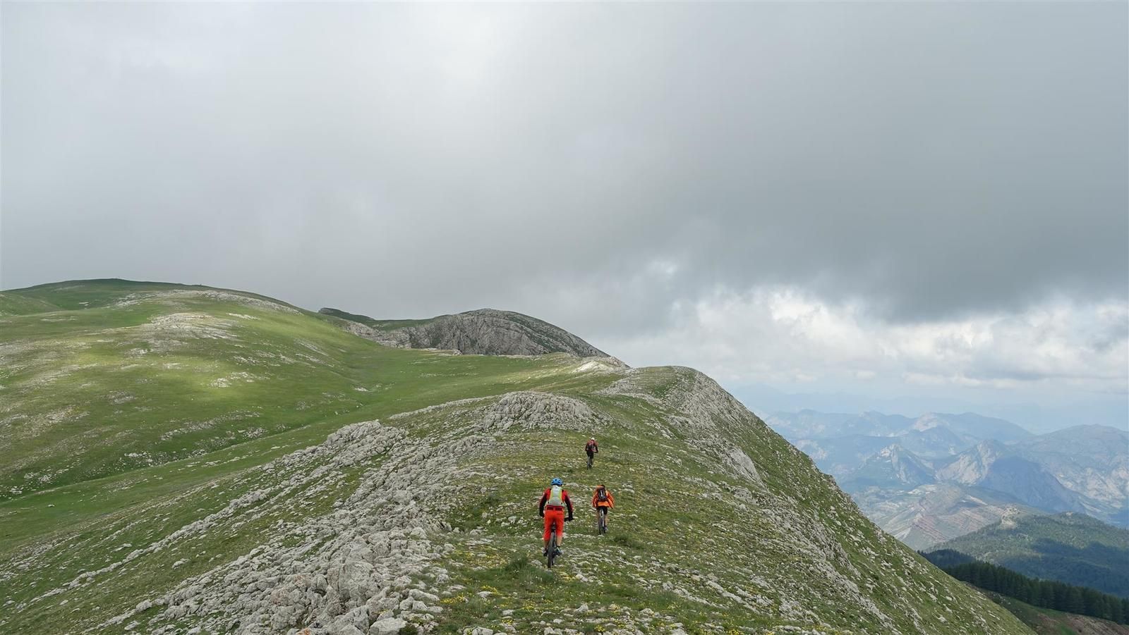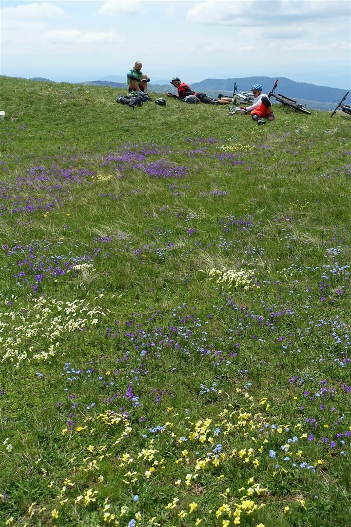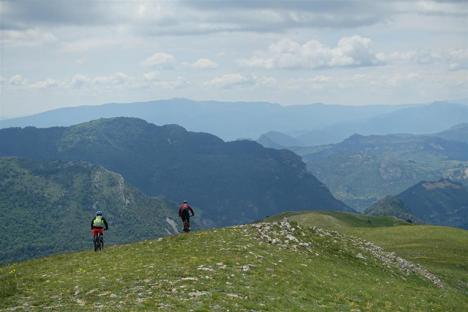 Journée de vélo de montagne dans les Préalpes dignoises, sur les Monges, ce sommet doté d’immenses prairies d’altitude qui sont autant d’invitations à rouler. C’est un terrain dessiné pour le VTT, découvert à pieds en octobre 2017, et qui offre des descentes intégralement roulantes dans des alpages fleuris actuellement en explosion de couleurs. La crête sud-ouest des Monges, qui s’apparente plutôt à une large croupe de prairies d’altitude, se parcourt ainsi à la descente exclusivement sur la selle, moyennant quelques slaloms entre pierres et… parterres de fleurs de montagne, et justifie bien le long portage de la fin de la piste aux Bastides à l’antécime est, via le col de la Croix de Veyre au versant nord littéralement jauni par la floraison. C’est une ligne ludique et esthétique à souhait sur cette crête peu marquée mais panoramique, avant une fin de descente plus raide et technique sur le versant nord de la crête de Pierre-Mont.