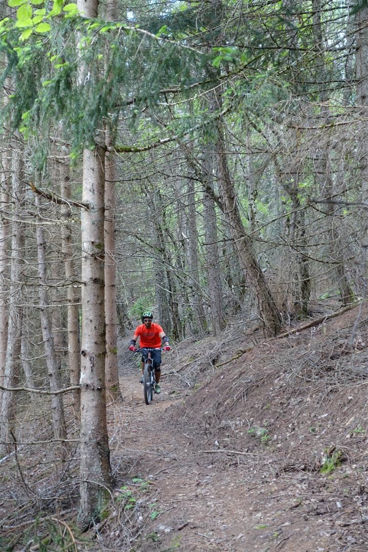 On peut alors faire refroidir les disques dans la descente de la piste de la Bastié puis la remontée au col de Font Belle et à la dalle aux ammonites, l’occasion de croiser un chevreuil qui traversera la route devant nos roues. Nonobstant pas mal d’arbres entravant le GR6 au niveau du ravin de Prajentre les sentiers s’avéreront être des monotraces de première qualité dans la forêt de sapins et de hêtres, des chemins à flanc étroits mais bien tracés sur terre ou tapis d’aiguilles, une belle conclusion à cette journée de poussage, portage… mais surtout roulage dans les alpages ! Un massif confidentiel très peu fréquenté, oublié des skieurs l’hiver et randonneurs l’été pour sa faible altitude et son caractère peu alpin, mais en fait parfaitement adapté au vélo de montagne…