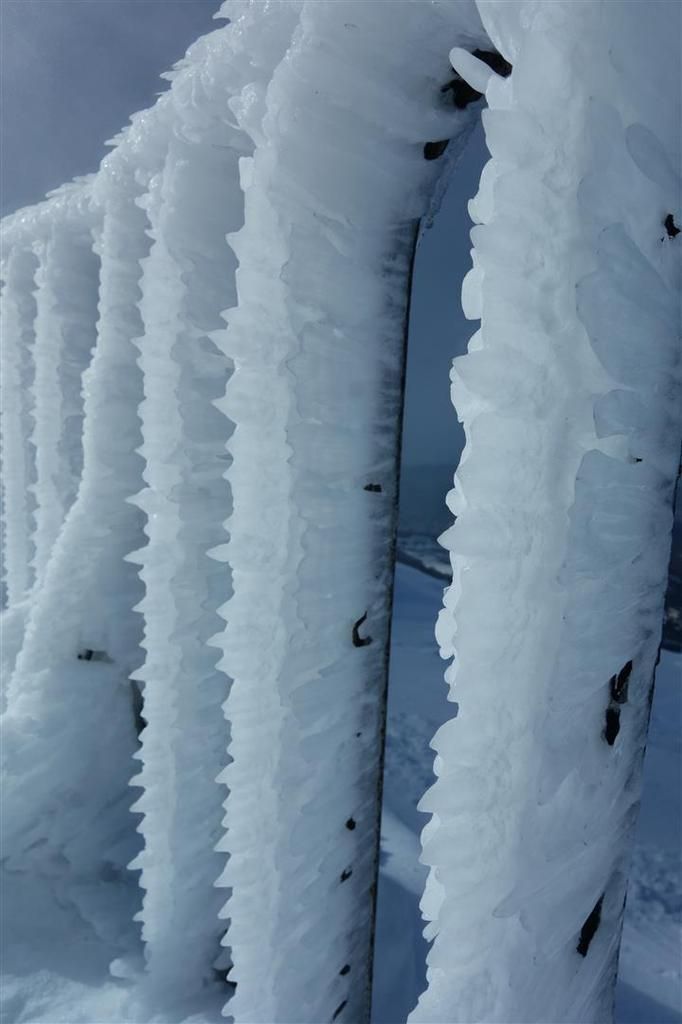 La grosse chute de neige ventée de la veille donnera des allures patagoniennes au sommet, avec les pitons de basalte complètement plâtrés et évoquant presque les champignons de neige du sud de la cordillère des Andes. La montée du premier jour sera un long combat à creuser une tranchée dans les 20 à 80 cm de neige fraîche du bas en haut, tâche rendue encore plus ardue par notre manque d’acclimatation et l’essoufflement concomitant au-delà des 3500 mètres ! On restera également vigilant sur la nivologie avec cette importante couche de neige fraîche, mais l’absence de travail du vent et la stabilité (apparente) de la couche de poudreuse ne nous dissuaderont pas de continuer. La récompense de ces 3 heures de terrassement dans les 1000 mètres de pentes vierges prendra la forme d’une descente exceptionnelle dans une neige vierge souvent très légère, sans fond au sommet, les nuages de poudreuse répondant à la mer de nuages entourant le volcan sous nos spatules !
